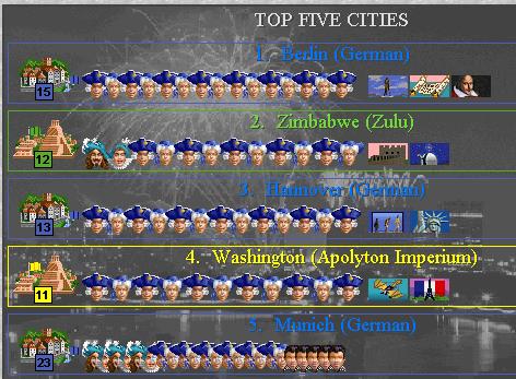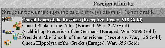 and had to bribe Zulu Musk for 297G to survive. Move units into place to attack Atlanta after using Dip to investigate city (no Cannon, but has Rifle and 3 Musks). Bribe wandering Barb Knight 82G (dip now has a 2-move escort). Kill American Dragoon with Fanatic healed at Kansas City. Find Rhodes and bribe it 450G, get 25G, sell Gran for 60G. Greek gov overthrown.