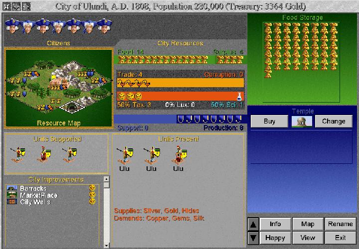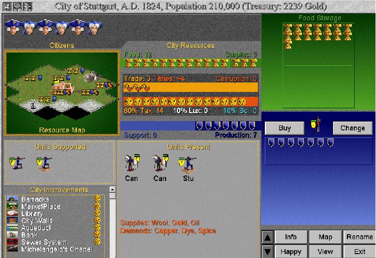 get 315G, Magnetism, and Mike’s! All Dragoons become Cavalry, Crusader becomes Dragoon, Musks become Rifle. Sell Granary for 60G. Getting Mike’s gains us an additional 300 gold per turn. Move taxrate to 80-10-10. This nets us almost 1200G per turn.