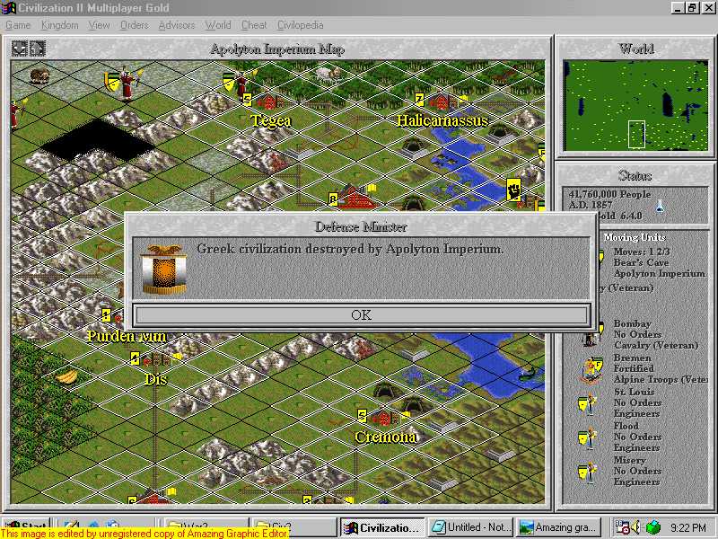 We have 1 remaining foe, the Greeks with 14 cities.