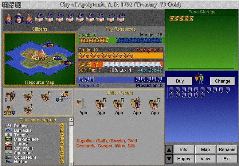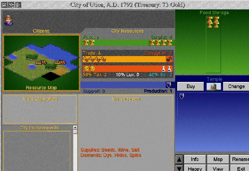 Send Fanatic to Utica for defense. Change Utica Phalanx to Temple. 1792 - Apolytonia size 12 again. Set to Xin. Fanatic reveals some Utica squares on way to new city.