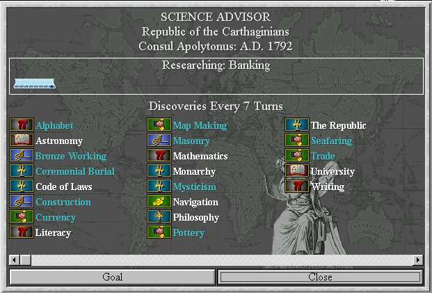 Also, I note on our list of advance that we currently have that the last three we have researched (Astronomy, Navigation and University) are all "White" techs, meaning (I think) that we were the first to research them, but given the number of wonders that the other civs have, I don't see how this is possible (unless somehow the other civs acquired them after us and also got several others afterwards??