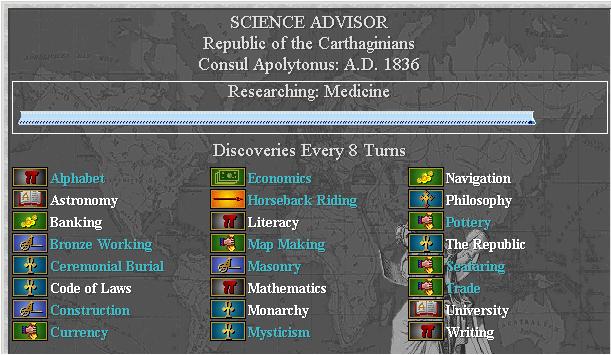 starts toward Apolytonia. Apolytonia builds Explorer, starts Settler. Apolytonia celebrates to size 12, so I adjust Tax Rate and return to Xin. Caravel leaves Apolytonia with Explorer, heads toward Utica. Medicine very near completion.