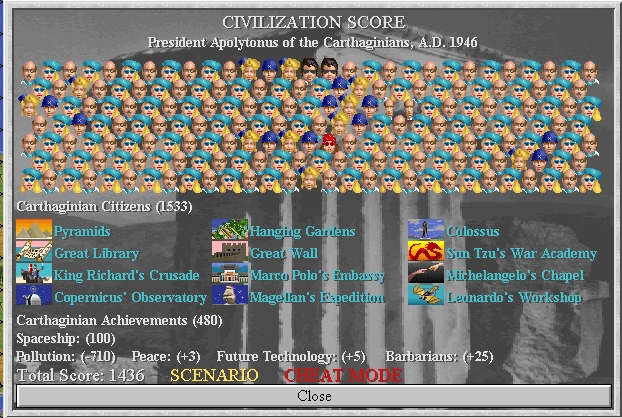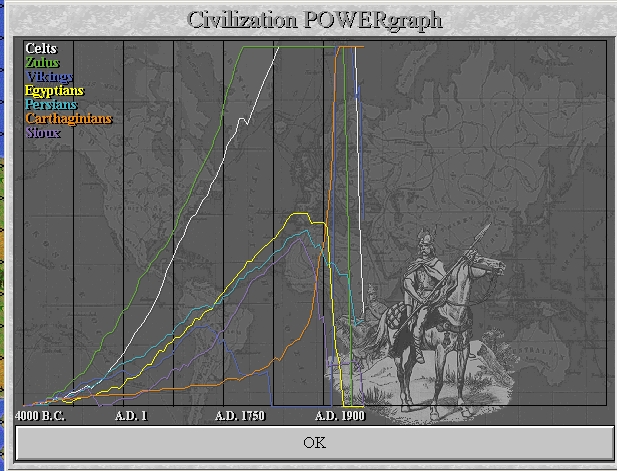 I've played on a few turns from 1930 and launched our space ship - eta 1939. Often in EL games, after the ship is launched, I sleep my units and just hit the return key until it lands. However, in this game, I thought the honour of all the others who have contributed to the game deserved more. So I am playing out an end game drama, at war with everybody - the Vikings, the Zulus, the Celts, the Persians, the Sioux and 2 late arrivals, the Spanish and the Russians. The Celts have been eliminated and the Persians, Sioux, Spanish and Russians are down to 1 or 2 cities each.