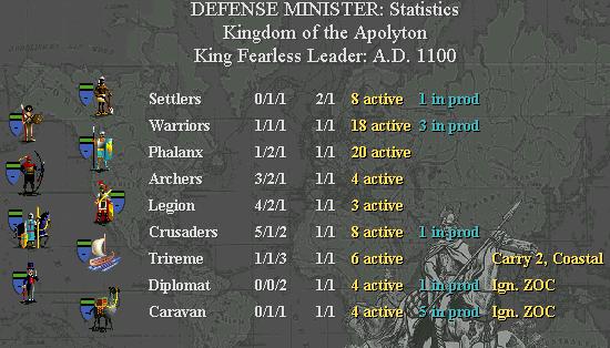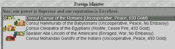 He will be the one that leads us in the war with the Egyptians (and Americans)…ships with troops are moving to Light to stack them there before the great attack…warriors are being build(because they will upgrade to rifflemen as soon as we get Gunpowder…Leonardo’s workshop only needs 4 more caravans(2 will arrive next turn 1 is on a ship near Walvisbaai waiting to be put over to the Apolytonia continent and one is waiting on the shores near walvisbaai with the same goal to finish Leo’s.) troops are send to Apolytonia for transport to Shadow.Diplo’s are being build for the war and the Indians are dangerously close to new castellion…keep an eye on them(and their diplomat) and try to prevent a war at least until we are done with the Americans and Egyptians.