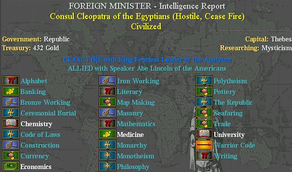 Civ2 Demo Game #1 City-Planner, President, Historian Civ2 Demo Game #2 Minister of War,President, Minister of Trade, Vice President, City-Planner Civ2 Demo Game #3 President, Minister of War, President Civ2 Demo Game #4 Despot, City-Planner, Consul