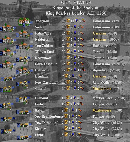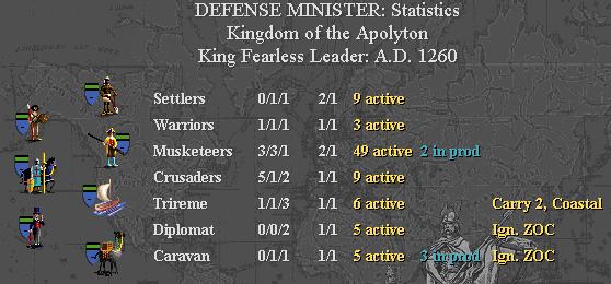 1200 - Gunpowder discovered! Those sneaky scientists fudged their schedule report to make themselves look good. No harm, though; Leo's is announced and the upgrades commence. All Warriors, Phalanxes, and Legions become Musketeers. 49 of them!