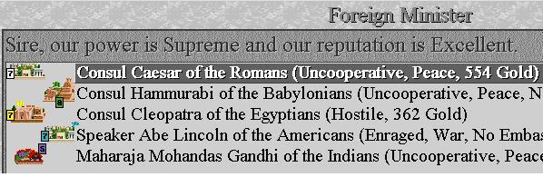 1240 - India becomes a Monarchy. They get Monotheism from the Babs. We shall have to watch out for Crusaders from them now. It occurs to me I haven't been looking at the Foreign Advisor screen carefully! We are met by an Egyptian Explorer. I agree to meet in return (since we have a cease-fire) in case they want to trade techs. No such luck, they just demand Invention. Fortunately, they just grumble at my refusal and go away. I was tempted to demand Tribute in exchange for our patience, but decide not to provoke them. It is then announced that our cease-fire has expired. Oh well!