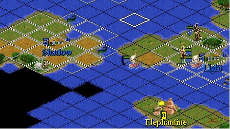 1220 - Indian government overthrown. I have been moving troops to Shadow and Light, exploring a bit, and watching the Workers carefully. They are mostly well-placed, but I order some adjustments. The Settlers continue to irrigate and roadpave, but I am sending 1 to Light to get some improvements going there. Have been delivering Units to Shadow and Light on the North side of the islands and letting them march to the cities to save Trireme movement. It appears to me that we are approaching unhappiness in some cities. I have started a couple of Coliseums with the idea that construction can be changed to Aqueducts or whatever if my concerns are unfounded. I am sending a Diplomat to see what's up with the Egyptians and their progress on Adam Smith's, but it won't get there for several turns.