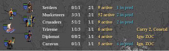 1320 - Egyptians "about to complete Adam's" WHAT??? I just checked that and they were not even close. Wish I could build like the AI's do! I was expecting to have another Crusader and Musketeer!!! But that's OK, better now than way later. I think I can take Elephantine. I have 2 Triremes, 3 Crusaders, and 1 Musketeer ready to go from Light. That Indian Elephant and unknown unit really bothers me, though!