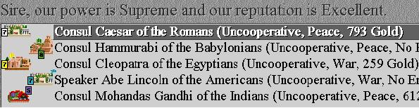 The Egyptians send an Emissary and I decide to talk to it (we're already at War, right?). It demands Invention as if we hadn't just taken one of their cities. I tell it to drop dead, hoping maybe it will offer gold for peace. It doesn't. India is a Republic now. In fact all our opponents are Republics now.