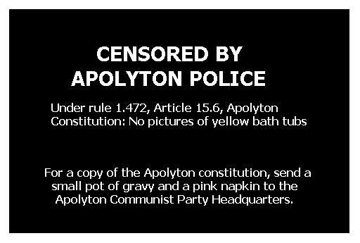 MrWIA: I strongly support the Apolyton Today newspaper provided it reports exactly what is in the best interests of the people of Apolytonia and nothing that may cause harm to the public good. It is in my (and the Ministry's) opinion that that picture would have cause considerable public harm. No. I'm not going to tell you why that picture was so bad - I would have to censure myself if I did so - I hope I don't have to quote from the "Keeping Secrets from the People for Their Own Good" Act. And besides, I have not taken a bath for the entire time I have been in office.