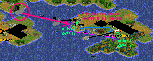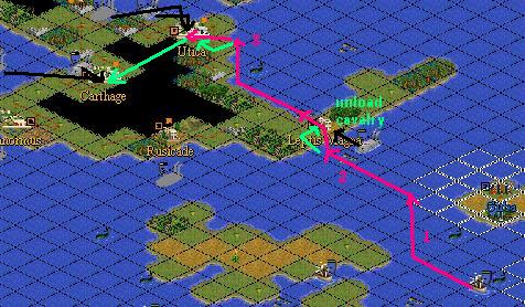 as soon as it’s fit enough we send the caravel to tigis and take it over with the cavalry(move in the caravel unload 1 rifflemen as deffence and load the cavalry again and move up to Carthago nova and take this emptied city out then.