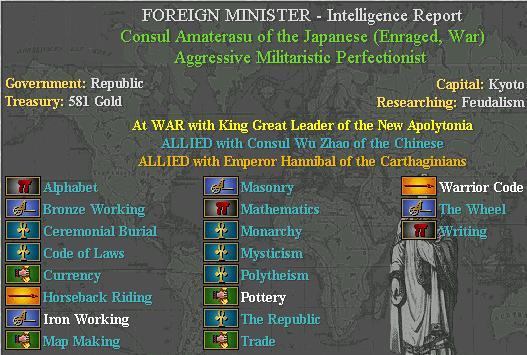 A- We should have 4 dips to China, steal Pottery, Iron Working, Warrior Code, and kep the boat near the Japs coast and steal Feudalism,