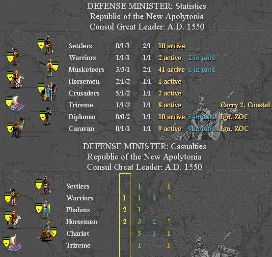 Use 7 Caravans and 120 gold to finish Adam's. 1550 - Carth's attack our Trireme; we win, become Vet.