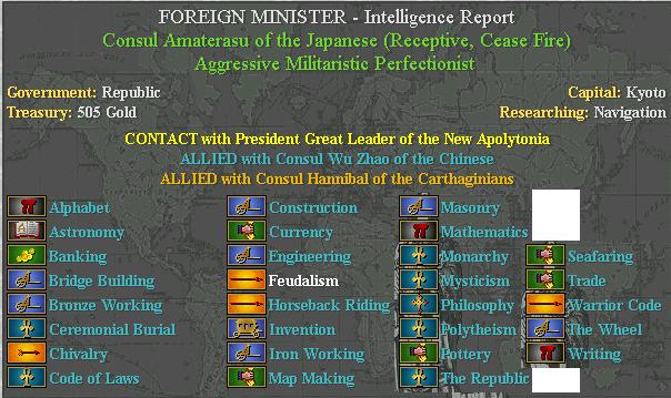 We could send a diplomat instead. Explorers are quick but of little use once they've explored a given area, and the area in the centre of Japan isn't that large. However a diplomat could steal tech or bribe units/cities. Plus explorers cost 1 shield in support per turn, diplomats nothing. Whilst he might get expelled, I like to have the options a diplomat presents.
