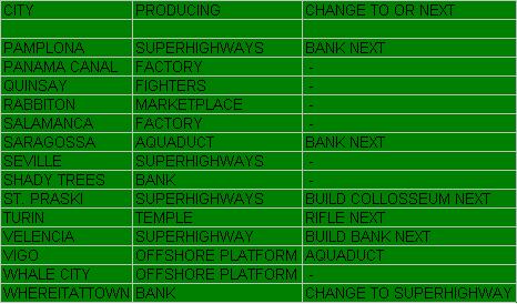 6 cities are building Superhighways, with a rush order for Cadiz. I suggest that the others be allowed to build a couple of turns then rushed at the President's discretion.