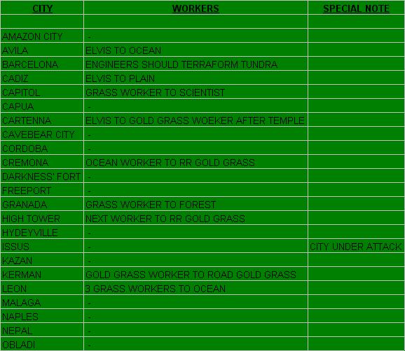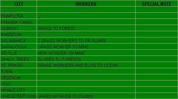 Avila: (full food box) assuming we rush to 160/200, remove forest worker, move grassland worker to ocean (3 elvi). This leaves 21 shields (enough for a 2-turn completion of superhighways). moving the worker from the 3-food to the 2-food will make the game place the worker on the 3-food trade space next turn when it grows. We currently have 5 unhappy people converted by 5 structures (max 5). the 3rd elvis ensures that the next pop (16) will be content instead of unhappy next turn and will celebrate. for the 2nd turn, when it grows to 17, we have our superhighways, put all elvi back to work using the forest or ocean depending on needs.