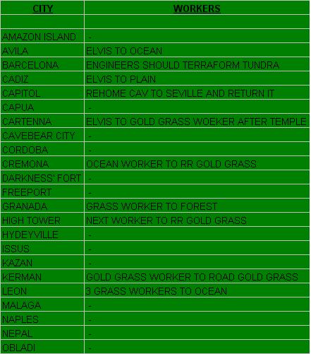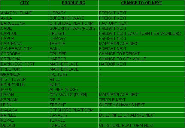 I have the Cruiser in Cordoba being changed to Freight, per an earlier request (it has Gold to offer). But the Unhappiness there is getting severe. We should at least build a Colloseum next. As it is, the Cuiser cannot leave port, or at least has to be rehomed in the same turn it leaves (it could go to Malaga, which is a happy city at the moment, but the production in Malaga would drop down to 2 shields).