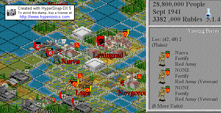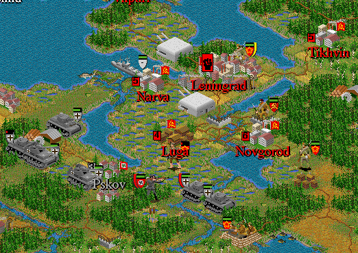 Ok, with the new turn grave news has reached us. Despite having stationed the bulk of my army in Narva the city has now fallen (taking more than 20 units with it). A karl seige mortar is at the gates of Leningrad and the city itself is so poorly guarded that it will fall easily to the fascist invadors unless we do something.