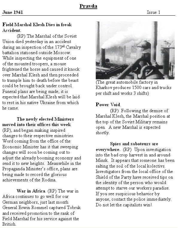 (RP), and began making inspired changes to their respective ministries. Word coming from the office of the Economic Minister has it that sweeping changes will soon be coming out to adjust the already booming economy and send it to new heights. Meanwhile in the Propaganda Minister’s office, plans are being made to record the glorious achievements of the Rodina.