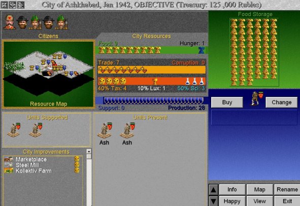 And my newest creation: Ashkabad which is producing 28 sheilds and just a short hop across the Caspian sea from the Caucass region. We will be getting trade units here soon and they will be joined by fresh troops for the front from this Industrial city:
