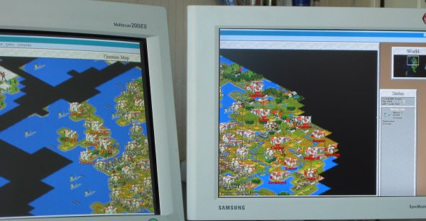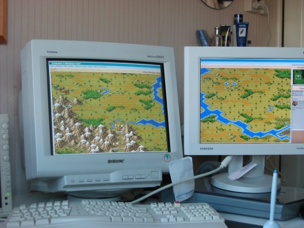 This weekend I finally bought a TFT screen and decided to play around with my old monitor acting as a secondary display. Seeing as Civ2 is a proper windows app you can also resize it over two monitors. Here's a pic from my temporary setup playing LOTR: