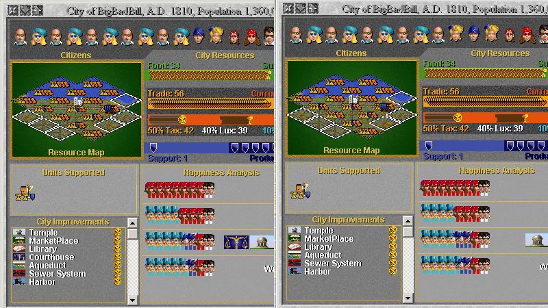 in democracy, courthouses act like a palace, not CfC, so they add an extra happy person after luxuries are figured in. as a demonstration, here's a city from the game with the courthouse, and then after it was sold.