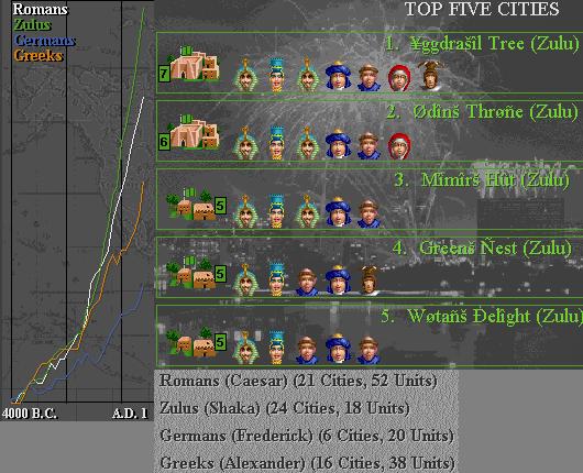 The Romans wandered the map for 300 years, searching vainly for rivers, specials, or huts. Finally, they gave up in despair and established the twin cities of Rome and Veii. Growth has been steady but unspectacular. Roman horsemen have fought off three barbarian landing parties, and a horse from a hut. Only a single warrior has been lost to the barbs, but no leaders have been captured