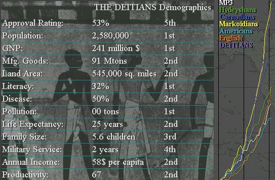Normal landmass, varied terrain, wet, cool, 4 billion yrs, Deity level, 7 civs