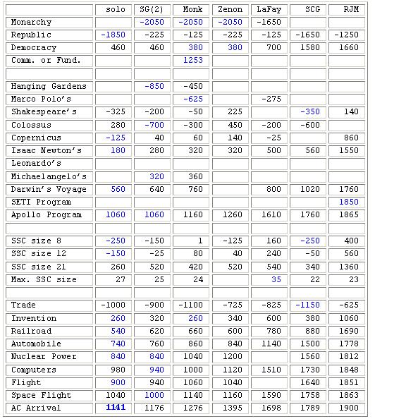 The table format has been revamped a bit. It was too late to include the key civ statistic, but this will be added onto the next game's table. Note that 5 columns per player are used, so that some names had to be abbreviated to fit. If you do not like the one I have chosen, let me know and I may change it. Also note that BC dates are shown with a minus and that the record holder(s) for each satistic are highlighted in blue. Every player managed first place in at least one category, so congrats to all!
