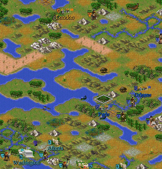 This means that an SSC can reap the full benefit of road/railroad bonuses on its trade routes to a far-off foreign megalopolis by building a road/rail connection to a local 'station' a mere 2 or 3 squares away. The 'station' must be located along the qualified path between the two cities. This location can be found by using to GOTO command to send a settler to the remote city and then terminating its travel just outside the SSC's city radius and founding a new city. When the road/rail is complete to the 'station', the full bonus will apply on trade routes to the foreign city.
