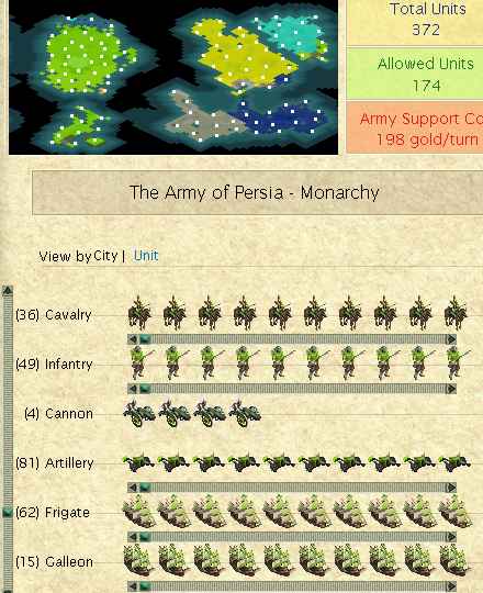 Building all those horsemen turned out to be a bad idea. Upgrades in Monarchy are too expensive, so about two thirds of them are serving as MPs to the extent that they're doing any good at all, and they're eating up a lot of gold. I'll probably disband most of them for shields in outlying areas once I get out of mobilization in a few turns; they're costing way too much gold that really needs to be going into research.