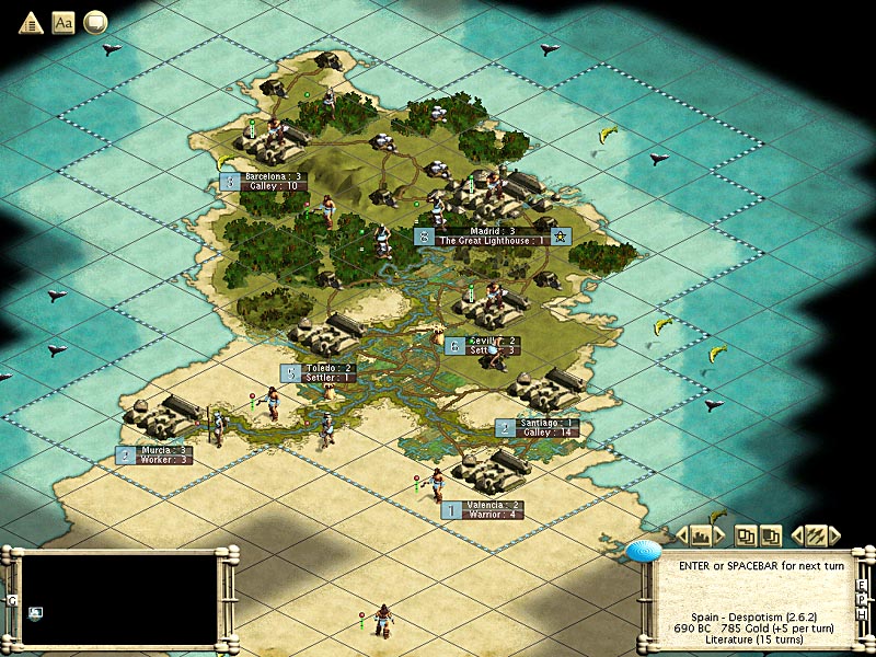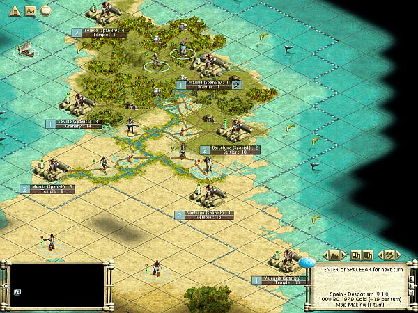 Spain started the period know as DAR2 (for reasons completely unknown by the Spanish) researching Map Making. By 1870bc Barcelona had finished its Granary and the Road to Madrid was finally completed by a gang of workers. The workers began irrigating the floodplain wheat and soon settlers and workers would flow from Barcelona.