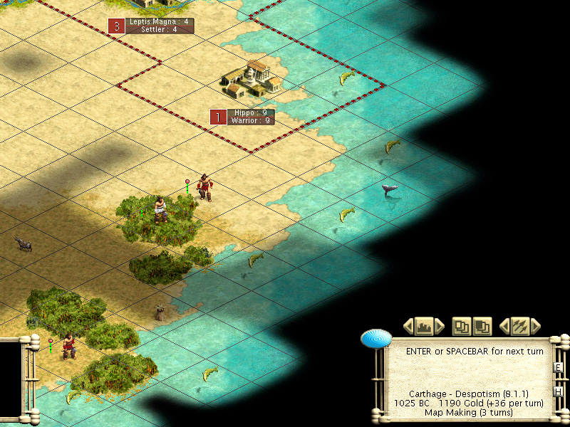 1990bc: Seville founded 4 of western wheat. Set to build settler right off, as production is not too good currently. Madrid has now produced a couple warriors for the barbs; starts on some workers to fight the jungle and the desert. In 1870bc, Seville also builds a warrior, and also starts on a worker. It is about here in the reporting that I go from reporting every detail to reporting only the major things. Also, I would like to go into a bit of detail at the end of this DAR about the 'power of the worker'.
