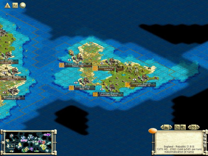 Meanwhile, those rumpled scientists went back to work. Steam Power was discovered in 8 (?) turns, followed by Industrialization in 9 and then Electricity in 9. A large and growing worker force RR'd the home isle and set sail for the colonies to RR them as well. A forbidden palace was constructed on the eastern isle -- the Queen was a bit befuddled on where to construct her second palace, and ultimately decided on the eastern isle in the hopes that it would provide benefits to much of the home isle, all eastern territories, and even the southern glacier. Preserving little corruption in the science city of London was important, and Elizabeth was growing restless at home, thinking that decamping her royal entourage from London for more exotic climes in the future would makes sense.