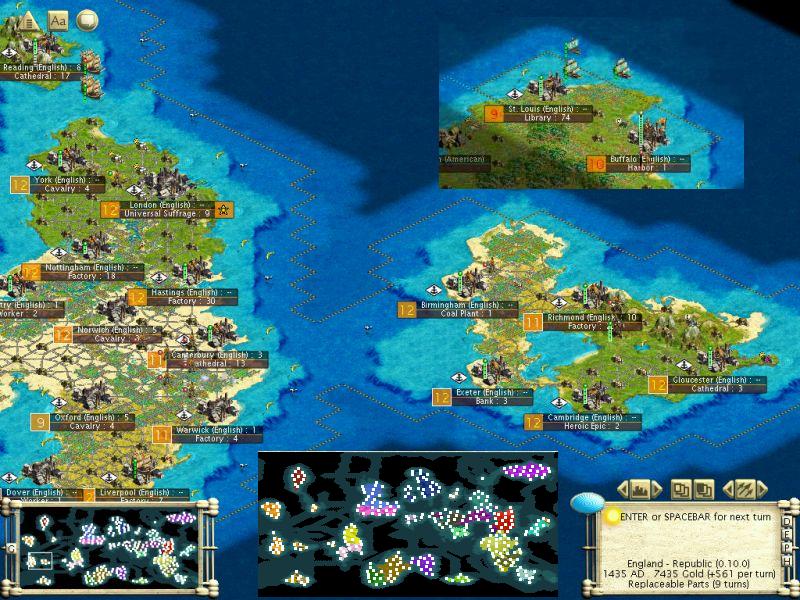So . . . it's 1435 AD. I should be able to withstand a furious counterattack from the Americans, and eventually take all of America, albeit on a slower pace than I would have liked. Replaceable Parts is due in 9 turns. No one has anything other than Medicine, and then only Germany, the impotent Ottomans, and perhaps Persia (but Persia's competitiveness is a mere blip caused by the free tech at the new age), they are a MOnarchy (long war with Celts) and pose no present threat. I'll complete Universal Suffrage soon, and ToE is a foregone conclusion. The scariest competitor is virtually no more -- the Ottomans have almost been kicked off their home continent by the Mongols. The Ottoman capitol should relocate to the southern ice island sometime soon. I don't worry about the Mongols as a tech / economic challenge, and I don't worry about a Mogol invasion. Germany still presents an economic threat, but I suspect they will spend valuable time on Nationalism and maybe even Free Artistry. Bismark never took the French coal city before peace, meaning he has no access to coal, and no one else with coal in their borders is very close to Steam Power. Germany hasn't however, enjoyed its Golden Age yet, but I suspect that I will be able to divert all that Golden Age gold to England's benefit in any event.