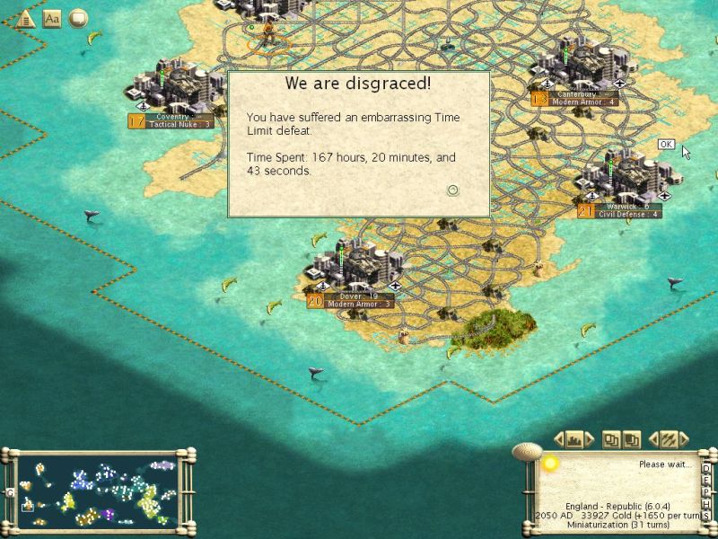 It seems most are not doing anything with these wars as no cities have changed hands except the few I took on the tundra island. with everyone having at 200+ units and no tanks, I do not see much going on. Only place that looks like it could is the Arbia/Egypt land. You will need so many transports to get enough troops to ground that it is not hapening. I have seen very little come at me so far. The Germans have sent maybe 3-4 galleons and 10 frigates/ironclads. They are in second place.