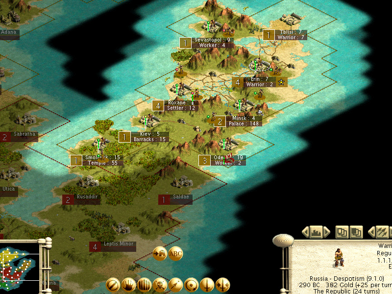 Odessa founded. It’s fairly close to my core cities so it won’t have too much corruption. Unfortunately it will have to share some of the good shielded grassland tiles with Smolensk, but this is the best site for my sixth city.