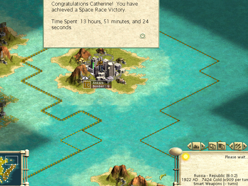 1868 AD: the Apollo Programme is finished. Our spies stole Nuclear Power from the Germans (they were busy elsewhere). It is time for our cities to stop producing useless MA (to replace even more useless MI!) and start working on the Ship components.