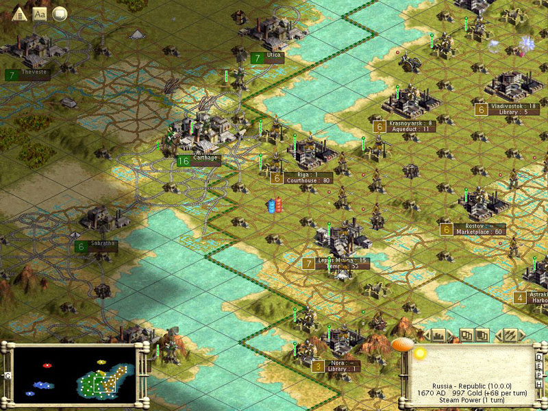1798 AD: the Modern Times (with Fission) and Russia is the first one. Japs at war (again!) with France, Babs with Germany. Going to research Ecology in 12 turns at -130 gold/turn. We can afford it, since our treasury is at 13’500 gold.