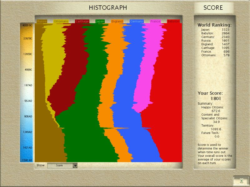 The Japs and Otto were at peace (for once!), but the Babs were at war with the Germans and the French, the English with the Otto and Germans. I had a 3-3 tech lead or equivalent techs (electronics vs. Mass Production) with every other civ. And 4’700 gold.