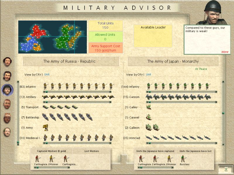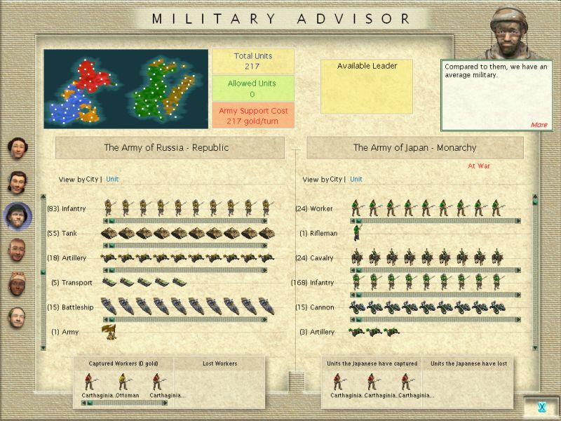 We just discovered that a civ can send military advisers to another one. Do you want proof? Very well: far to the south, near Shimoneski (tha last Japs city the French captured, don’t ask me why) the French would sent a Battleship to bombard an Ottos road, on which are 3 Workers are ready to repair it. Three bombers would then reduce the Battleship to 1 HP and it would limp back to its harbour. Next turn, a new battleship would…. The French did it for at least 15 turns. If this is not proof that the French navy was instructed by German military advisers…