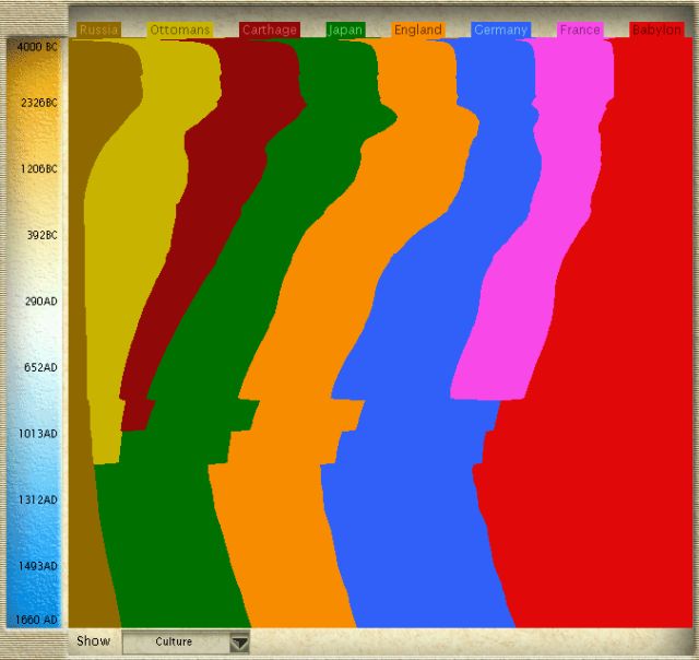 So what was I to do? Well, aquire gold related techs and build gold producing improvements only. Even though Russia is scientific, I didn't bother building libraries and universities till I did my own research. So the gold saved from having to maintain scientific buildings plus the small upkeep required to maintain a very small military meant lots of gold saved up. Being a stingy trader also helps get that extra gpt.