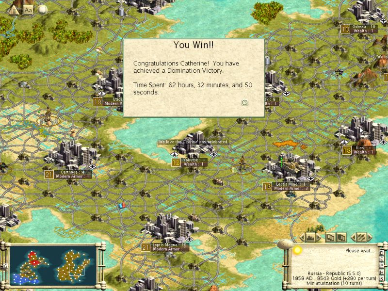 Thanks Theseus. I was originally going to head for a domination victory, which is why I have part of the Babs lands too. But along about 1650 (when I completed my conquest of the Japanese) I got tired of it and wanted to finish up the game to get on to BCV from MZO. There was no possible way anyone could catch me, even by diplomatic victory, since I had a GL waiting to rush the UN if that became necessary. I set defenders up at my port cities to protect from any possible marine incursions and then set all my workers to automate while researching techs as fast as possible.