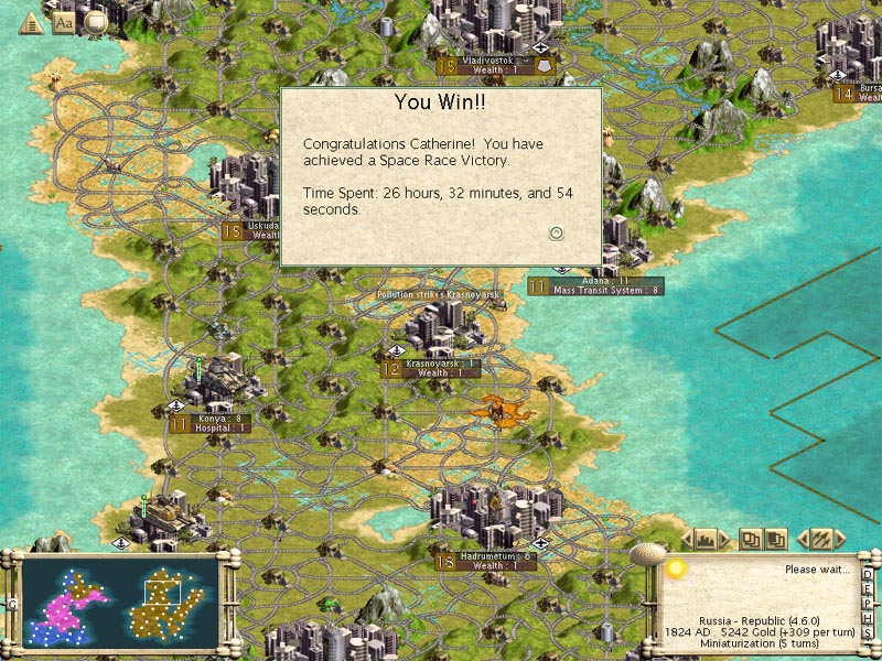 Finally, in building, I found that I needed to prioritize my efforts more than usual, since I really could not build everything in my cities (at least until very late in the game, when it didn't matter.) For example, at the time of infantry, I still had some quasi-important cities without marketplaces. Since I didn't have the massive gold reserves you can generate from tech sales and the GA in general, I could ill-afford to rush these buildings.