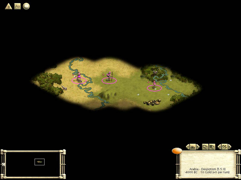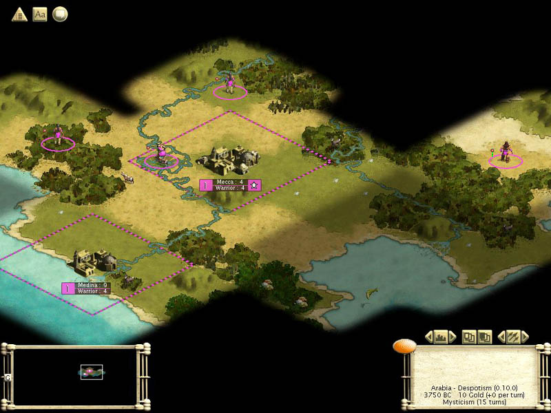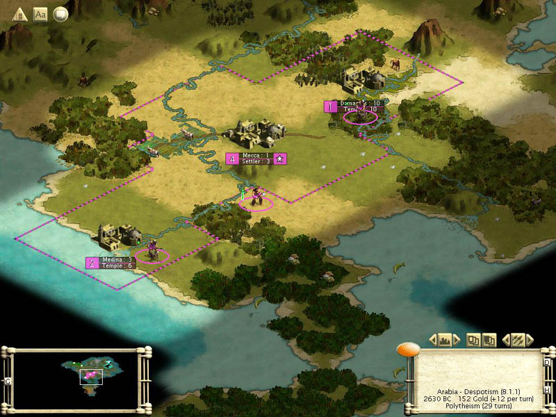 2. Move the Settler East then NE and settle a bit further North along the River. This city-spot would not access the Game tile, but could share the Cattle tile with Mecca once its borders expanded. Also, the city-spot lies at distance 3 from the capital, a ring which I've always liked to exploit.