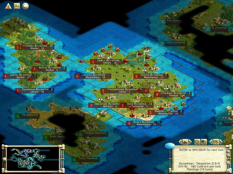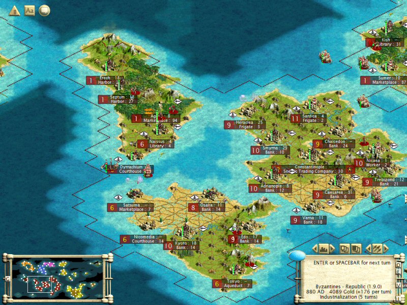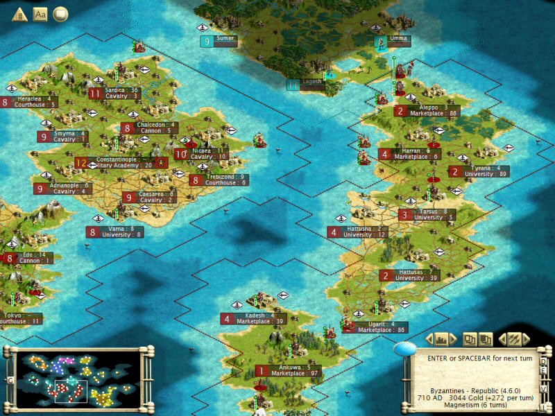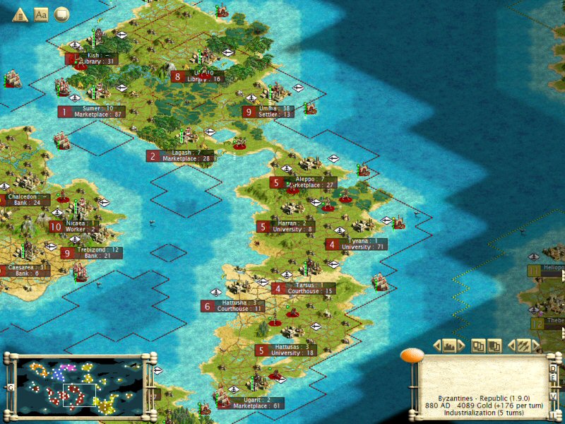 During this DAR I conquered both the Hittites and Sumerians. I had somewhat neglected settling on the two jungle islands, only getting 3 of the 5 cities on the closer one (one of which inexplicably culture flipped to the Sumerians despite me having a library in it