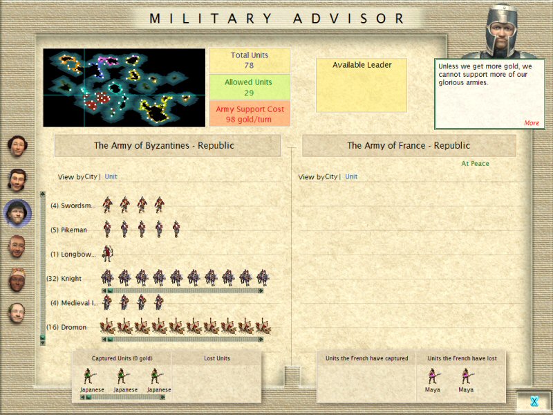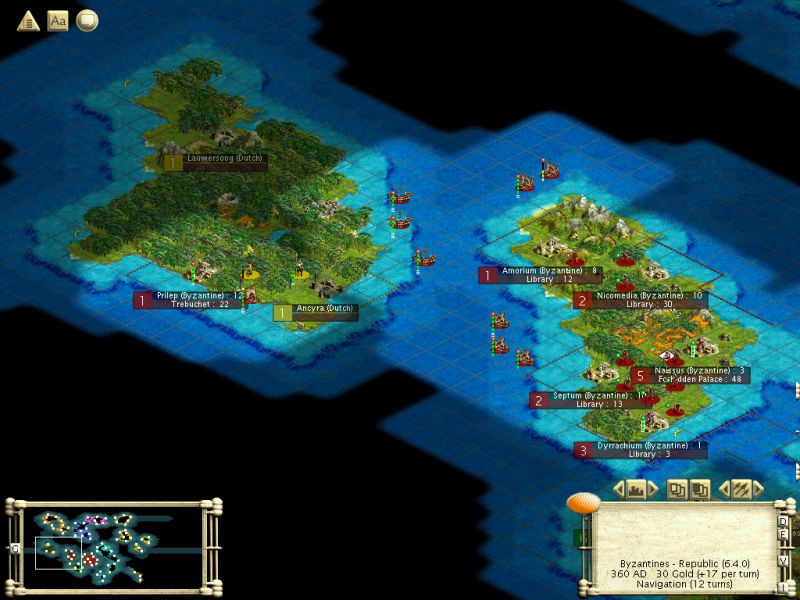 Ugh, a mini war is in the offing.On another note, something happened to me that I hadn't ever had happen before. While I was taking the closer jungle island I left my two cities undefended with the knowledge the Sumerians had no units that could get to it quickly enough and no ships close. The same turn I declared they put two medieval infantry in a caravel in their homeland and sailed it toward my homeland. I thought for sure they'd go for some of the undefended cities of my home island, but I wasn't worried since I had several cavalry in a central location and roads everywhere. Nope, they go for the cities on the small island and manage to take one before I can get a couple more units over there to take it back. I'm impressed! The AI passed up some cities that were nominally undefended, but had cavs in striking distance, to go for the completely undefended city that didn't have a cav in striking distance.