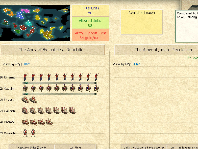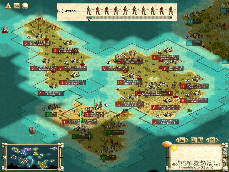 By now I had settled all of the western island save one city that Sumeria had managed to sneak in. I decided that Erech would be mine eventually. As for the university rush: I disbanded a pikeman and spent 372 gold - the next turn Constantinople would start Leo's. The rest was preparing for the death of Japan.