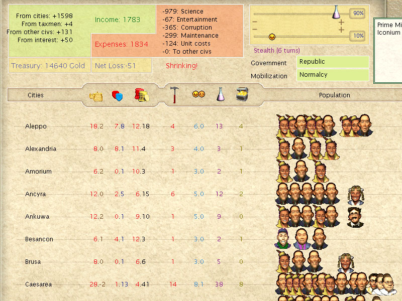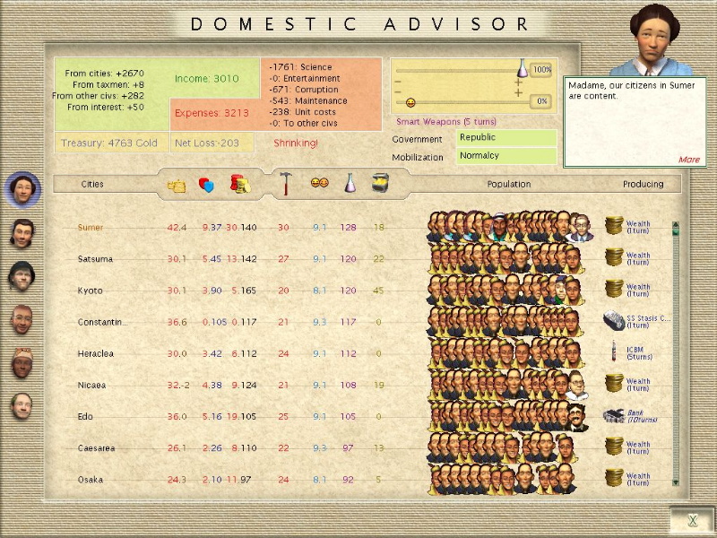 Sumer, located on the former Sumerian isle with no Palace or FP on its island, suffering > 20% corruption and with little production power, produces more science (albeit with the help of 2 scientists) than my capital Constantinople with its huge production capacity (both had the requisite Lib/Uni/RL). It had 8 water-based tiles. In contrast, Constantinople though only 1 pop point down, was the only non-coastal city in my empire for most of the game and look how far down the science order it appears even without corruption.So if you meet me have some courtesy, have some sympathy and some taste
